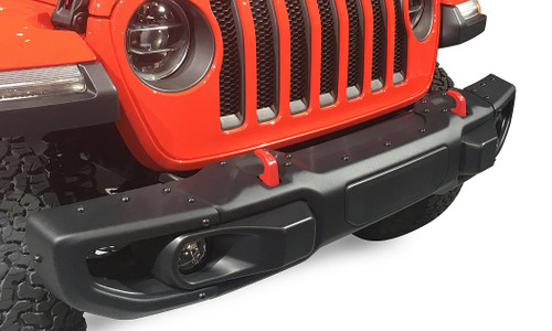 This Rubicon Jeep Wrangler Steel Bumper is the complete three-piece steel assembly including end caps. The steel bumper provides a rugged off-road look and improves performance with red tow hooks and integrated LED fog lamps. It comes in a satin black textured finish to complement almost any paint job. and comes with the red tow hooks. These Jeep steel bumpers fit both the Two-Door and Four-Door JL Wrangler models as well as all the JT Gladiator models.